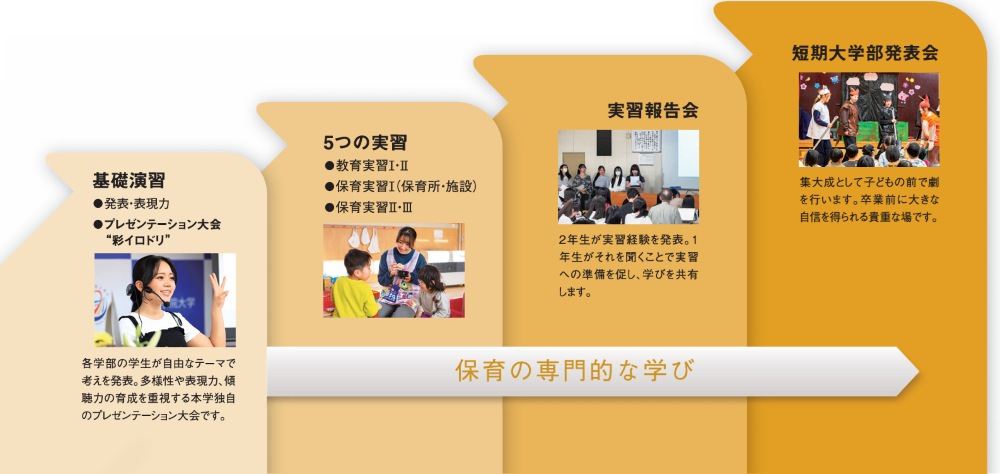 - 実践的なカリキュラム 保育の基本的な知識・技能の習得を目指します。講義系科目だけではなく、様々な人と関わりながら体験的に学べる演習系科目が多いのも保育科の特長です。また2年間の中で、幼稚園・保育園・こども園・福祉施設などへ行き、5回の実習を経験します。様々な経験を積むことで、子どもに寄り添う保育者の視点を磨き、実践力を身につけます