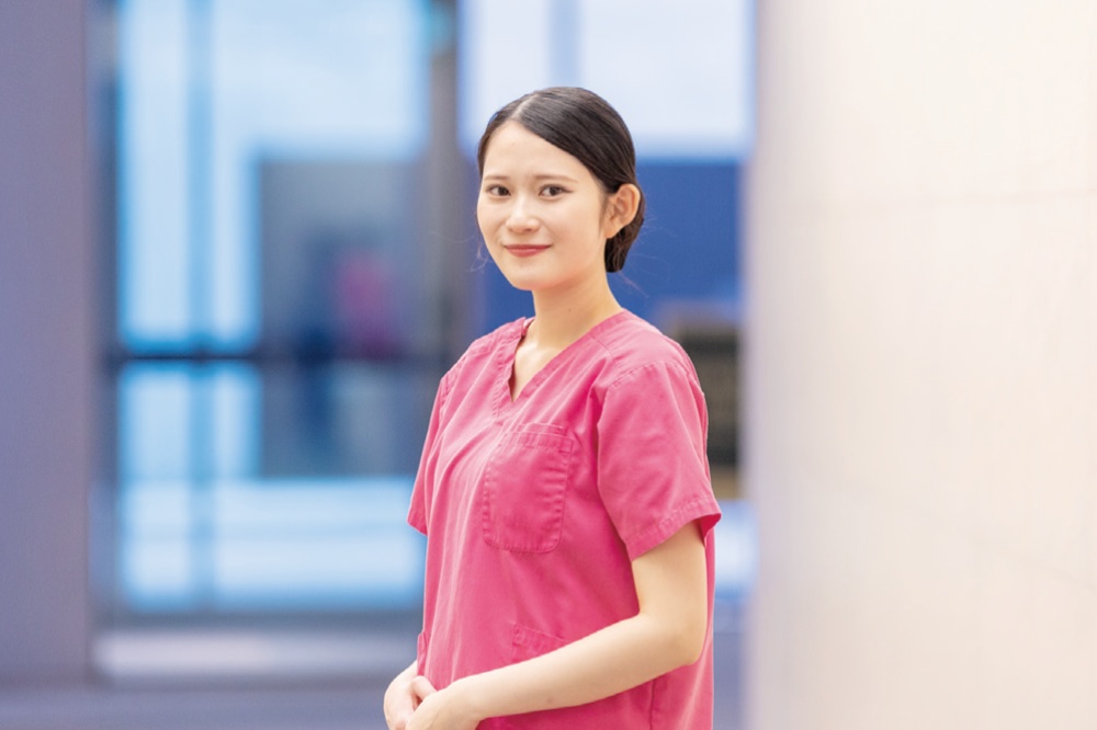 看護師になるという夢はありながらも、「どんな看護師になりたいか」という理想像が漠然としていた私の転機となったのは、2年生時の実習でした。担当した終末期の患者さんを気分転換にと散歩に誘ったのですが、なかなか前向きになってくれませんでした。それでも諦めずに声を掛け続けていたある日、患者さんの視線が腕にある点滴の管へ落ちる瞬間がありました。話を聞いてみると、初めて「散歩に行くと点滴の管が邪魔して迷惑をかけてしまう」という思いを持っていたことを打ち明けてくれました。その経験を通して、これまでなんとなく口にしていた“寄り添う”という言葉の本当の意味を学び、「患者さんの表情や目線から想いを察し、もう一歩踏み込んで支えられる看護師」という目標ができたことは、間違いなく私の成長を後押ししてくれています。