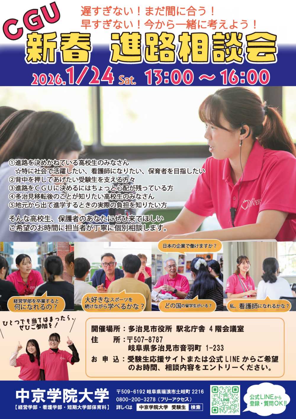 1/24(土) 進学相談会 進学相談会お申込みはこちら 開催日 1月24日(土)多治見市役所 駅北庁舎 4階会議室 開催時間 13:00 / 終了時間 16:00 ①13:00~ ②13:30~ ③14:00~ ④14:30~ ⑤15:00~ ⑥15:30~ ご希望の時間帯をお申し込みください。 会場 多治見市役所 駅北庁舎 4階会議室 (多治見市音羽町1-233) 入試広報部相談窓口 0800-200-3278(フリーアクセス) 進学相談会お申込みはこちら 中京学院大学の公式LINEで、入試やオープンキャンパスの質問にお答えします。 またオープンキャンパスや入試対策講座など受験生のためのイベント情報もお届けします。 お友だち登録して、中京学院大学の情報を手に入れちゃおう! キャンパスまでのアクセス方法を紹介しています。駅からスクールバスや大学敷地内に駐車場があります。 アクセス オープンキャンパス・クラブ活動・授業のことなど、さまざまなご質問にお答えしています。 Q&Aコーナー ページの先頭へ戻る