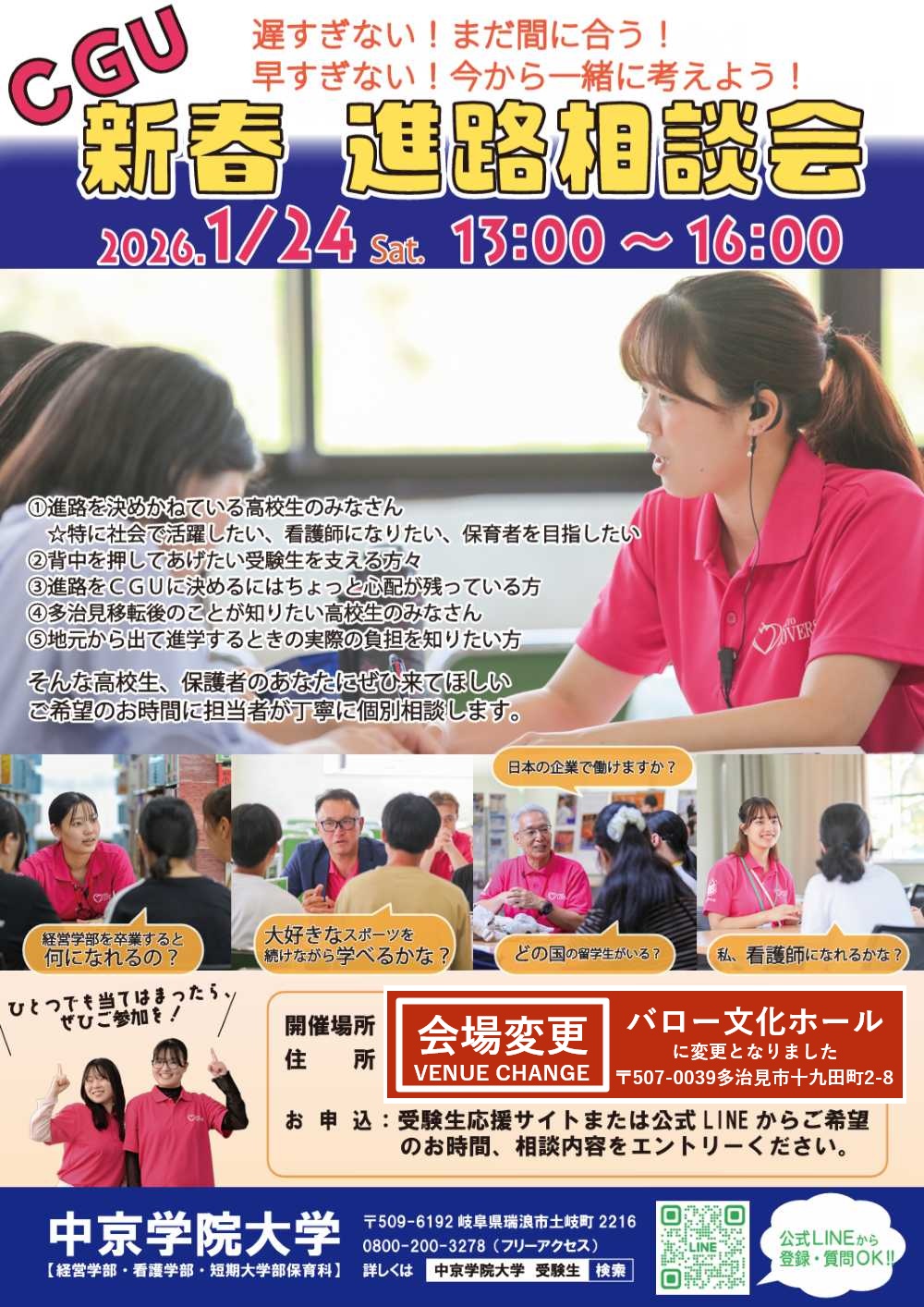 1月24日(土)に予定しておりました進学相談会は、衆議院議員総選挙の関係により「バロー文化ホール(多治見市文化会館)」に変更となります。参加をご予定いただいている皆さまにはご不便をおかけしますが、最新情報をご確認いただきますようお願いいたします。