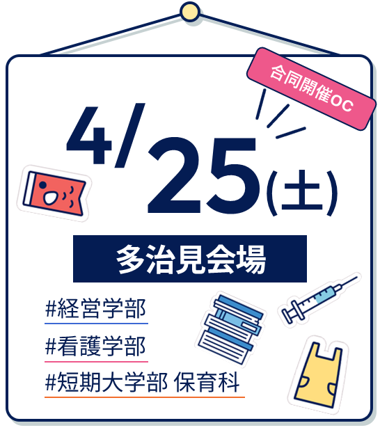 | 4月25日(土) | 3学部同時開催 | 多治見会場 | OPEN CAMPUS |
