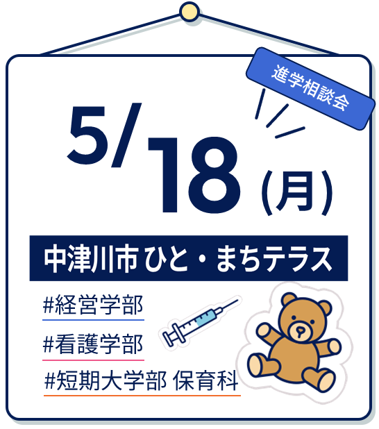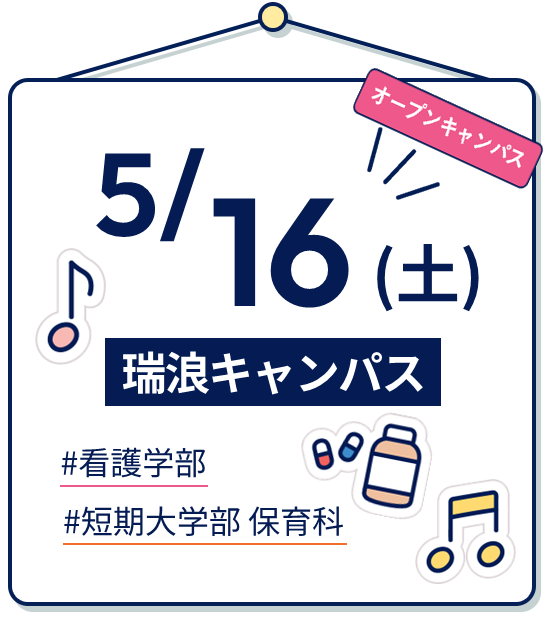 | 5月16日(土) | 看護・保育 | 中京学院大学 瑞浪キャンパス | OPEN CAMPUS |